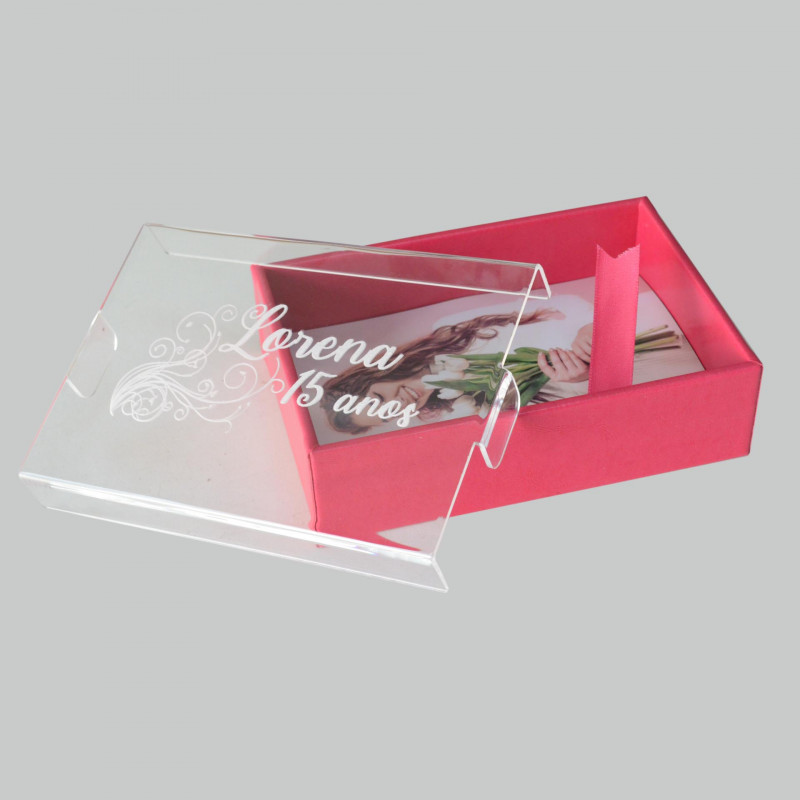 Caixa em courino com tampa acrílica gravado a laser.